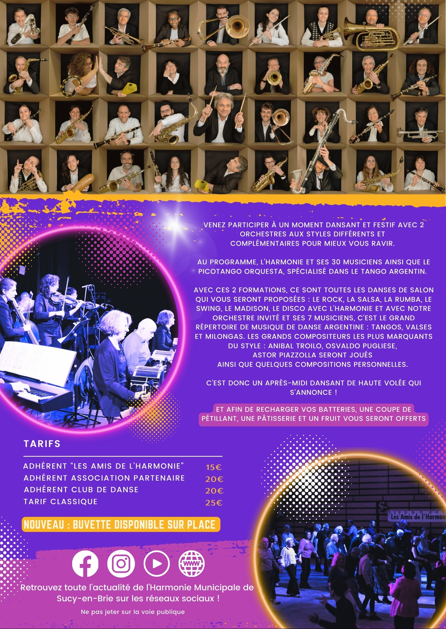 Venez participer à un moment dansant et festif avec 2 orchestres aux styles différents et complémentaires pour mieux vous ravir. Au programme, l’Harmonie et ses 30 musiciens ainsi que le Picotango Orquesta, spécialisé dans le tango argentin. Avec ces 2 formations, ce sont toutes les danses de salon qui vous seront proposées : le rock, la salsa, la rumba, le swing, le madison, le disco. Avec l’Harmonie et avec notre orchestre invité et ses 7 musiciens, c’est le grand répertoire de musique de danse Argentine : tangos, valses et milongas.